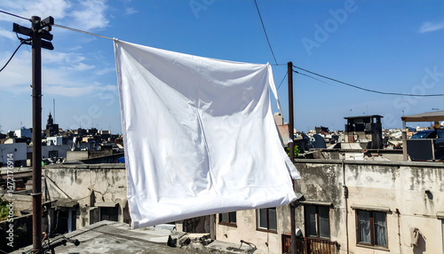sheet, linen, laundry, clean, white, clothes line, rope, hang, dry, building, architecture, urban, city, outdoors, sky, day, sunny, household, domestic, textile, fabric, texture, detail, bright, simple, everyday, routine, summer, wind, breeze, minimal, background, copy space, lifestyle, home, house, fresh, domesticity