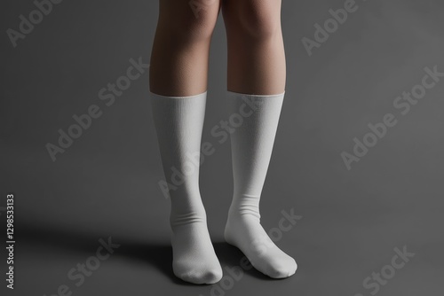 White socks mockup on female legs, isolated on a grey background. Close-up view