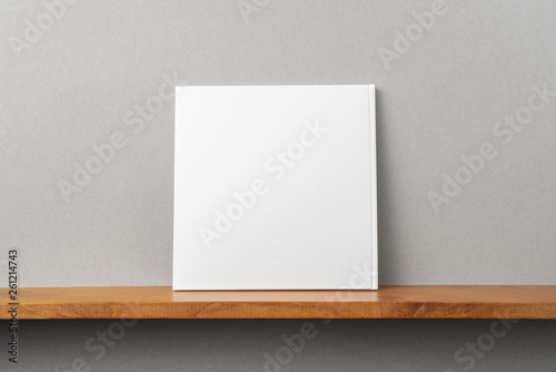 white square notebook on bookshelf and grey wall