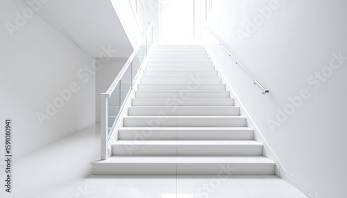 staircase, white, light, bright, modern, interior, hallway, architecture, design, minimalist, clean, empty, illuminated, ascending, perspective, geometric, vertical, smooth, simple, cleanliness, pure, contemporary, floor, wall, glasses, railing, step, hall, building