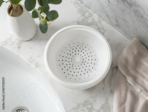 steamer, cooking, kitchen, food preparation, white, ceramic, bowl, container, perforated, hole, modern, minimalist, clean, hygiene, healthy eating, kitchen utensile, home, domestic, lifestyle, design, interior, marble, countertop, bathroom, sink, towel, contemporary, simple, elegant, steaming, home decor