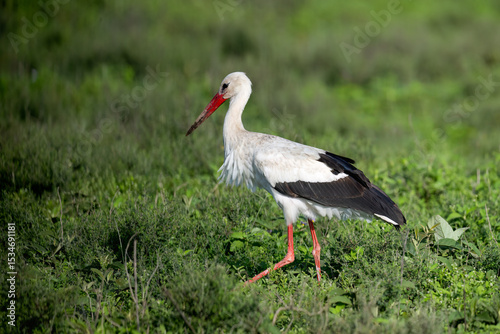 White Stork Foraging in Lush Green Plain