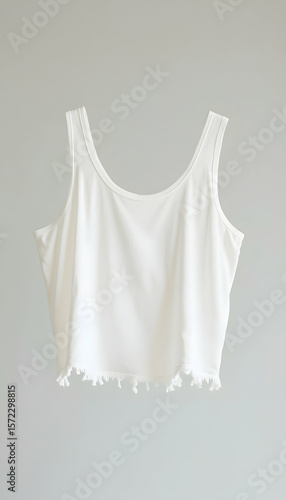 tank top, white, clothing, apparel, top, sleeveless, hanging, studio, background, grey, plain, minimalist, fashion, style, garment, textile, cotton, fabric, casual attire, indoor, neutral, simple, clean, summer, raw, hem, frayed, edge, modern, design, cropped, youth, stylish, clothes rack, display, retail, store, market, sale, shop, fashionable, youthful, day, studio shot, copy space, commercial