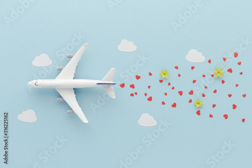 White top view Airplane . Hearts clouds blue airplane cloud sky background with copy space for your text. Flat lay.