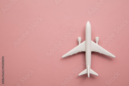 white toy airplane on a pastel pink background. Flight travel background with copy space