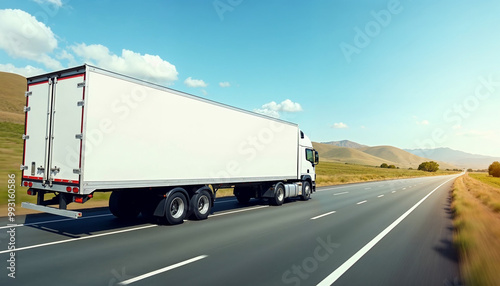 truck, white, trailer, empty, highway, cruising, speed, sky, blue, cloud, asphalt, green, landscape, distant, hill, tree, background, setting, text, branding, clear, transportation, vehicle, logistic, minimalistic, clean, blank, scene, advertisement, travel, journey, steady, trucking, movement, freedom, roomy, opportunity, signage, unmarked, simplicity, commercial, nature, wide