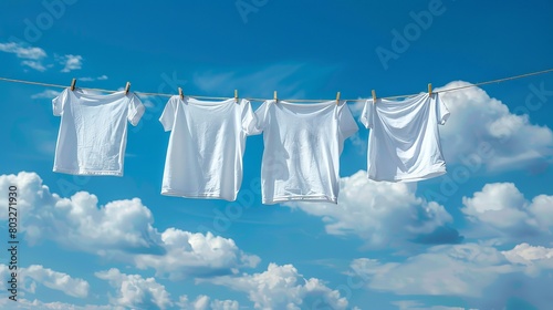 shirt, clothes, laundry, clothing, t-shirt, white, blue, clean, clothespin, dry, line, sky, fabric, hanging, cotton, rope, drying, clothes line, hang, apparel, cloud, fashion, sunny, fresh, summer, laundered, textile, breeze, chore, garment, household, pinned, washing, air, care, domestic, outdoors, background, day, children, duty, eco, friendly, hygiene, material, peace, peaceful, pure