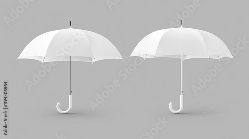 White umbrella, blank parasol front and side view mock up. Waterproof accessories for rainy autumn weather, design element isolated on grey background. Realistic 3d vector illustration, icons, clipart