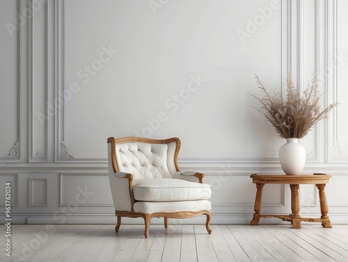 white, armchair, wooden, frame, classic, room, interior, design, elegant, sophisticated, minimalist, modern, contemporary, style, furniture, decor, home, living, space, comfortable, luxurious, cosy, inviting, aesthetic, beautiful, natural, light, airy, bright, simple, clean, line, detail, craftsmanship, quality, timeless, neutral, accent, arrangement, wall, floor, molding, table, side, round, vase