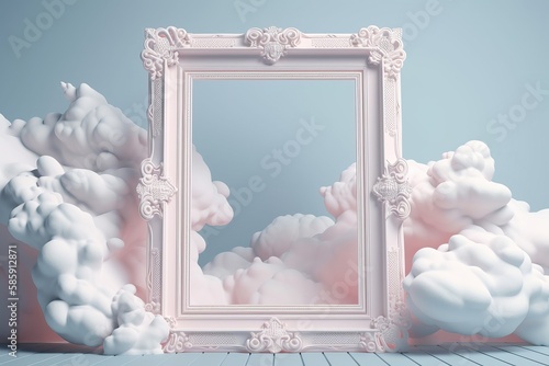White vintage frame on pastel blue background with abstract pink cloud shapes. AI generated