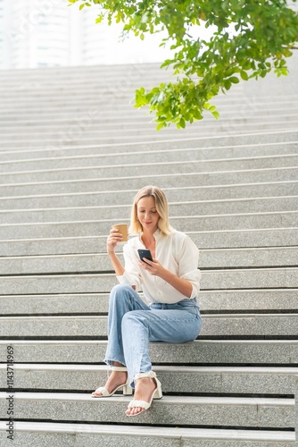 White Woman In Casual Outfits Sitting and Using Phone While Having a Coffee Outdoors