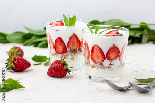 White yogurt with fresh strawberries granola and mint in two glasses on a white background.