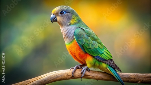 White-bellied Parrot (Pionites leucogaster) perched on a branch, vibrant plumage, detailed feathers, natural light, studio product photography.