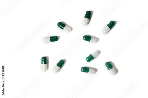 white-green pill capsules isolated on white background, medical concept, copy space, top view