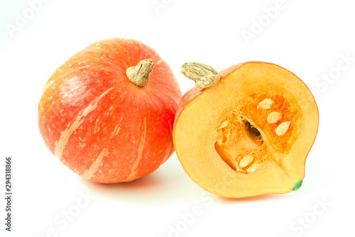 Whole and cut in half orange ripe pumpkins isolated on white background. Autumn harvest season