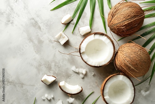 Whole and halved coconuts with pieces scattered, green leaves, on a textured gray background, close-up view.