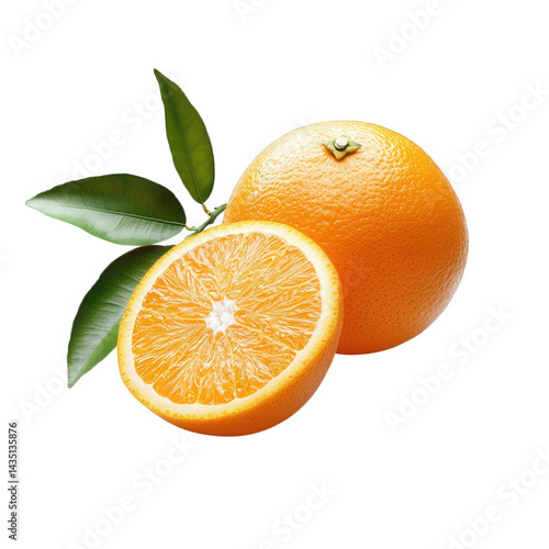 whole orange alongside a halved orange. showcasing the vibrant color and texture of the fruit. with green leaves accentuating its freshness this visually appealing representation highlights the natura