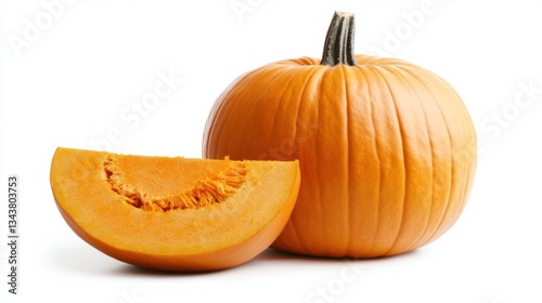 Whole pumpkin and slice of pumpkin isolated on white background.