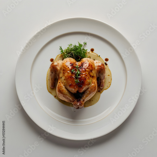 Whole roasted chicken glazed with sauce, served on mashed potatoes and garnished with fresh herbs. Gourmet meal presentation on a white plate over a clean, minimalist background.