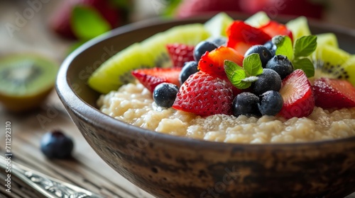 Wholesome Oatmeal Breakfast Bowl Topped with Fresh Strawberries, Blueberries, and Kiwi Slices, Garnished with Mint. Healthy and Nutritious Morning Meal Concept
