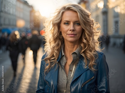 wide angle and full body portrait of attractive mature swedish female with long curly blonde hair and blue eyes, wearing blue Leather Jacket during late autumn sunset. Generative Ai.