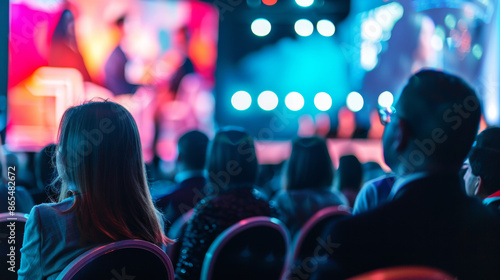 Wide angle angle from behind the seated spectators, blurring out the people presenting on the brightly lit stage