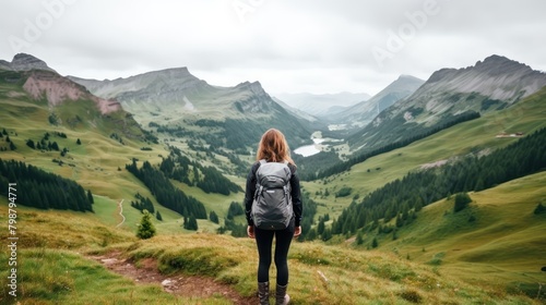 horizontal, one person, photo, young adult, color image, people, adult, outdoors, adults only, mountain, exploration, freedom, hiking, lifestyle, full-length, healthy lifestyle, adventure, backpack, nature, sky, enjoyment, female, vacation, vale, vitality, walking, copy space, sport