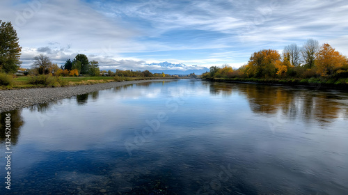 Wide Angle View of Calm River Reflecting Blue Sky and Clouds with Autumnal Trees in Scenic Landscape