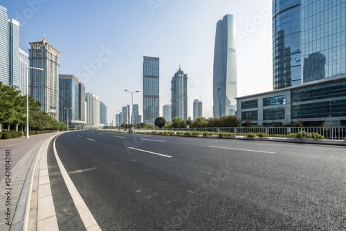 Wide asphalt road stretching through a modern cityscape with sleek skyscrapers and glass towers in the background, city streets, highway, urban landscape, modern city