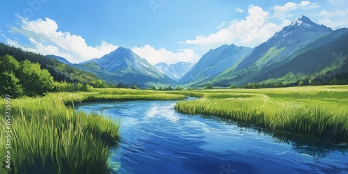 Wide blue river gently meanders through lush green meadows and majestic mountains, surrounded by tall grass, capturing the essence of summer days with its slow flowing beauty.