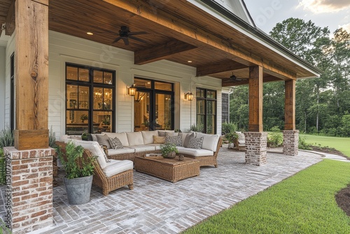 Wide front porch with natural wood beams and brick pavers on a modern farmhouse-style home in Mississippi, high-detail HD photography.