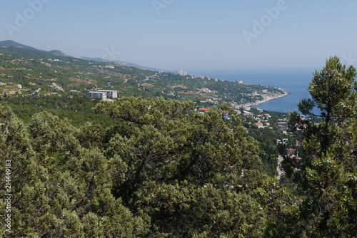 wide green trees under a blue sky on the background of a beautiful coastal town