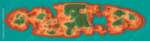 Wide panorama 3D Landscape Paper Cut style. Curved shapes with green brown pastel natural color. Abstract geometric lines pattern background art illustration for cover, design, book, poster, flyer