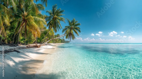Wide panorama background of tropical paradise beach white sand and coco palms Travel and resort concept