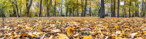 wide panorama of autumnal park. colorful yellow trees and fallen leaves on the ground.