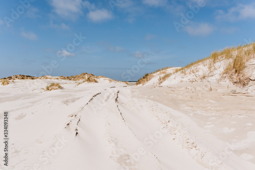 Wide sand beach landscape, sunny day, blue sky, Amrum, Germany