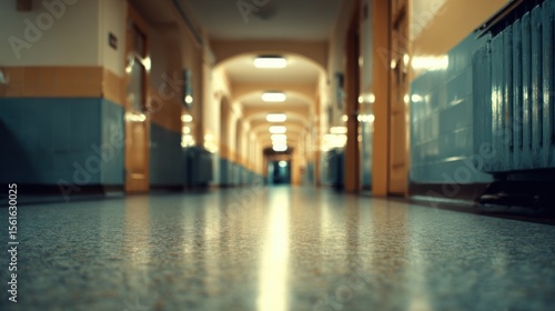 Wide shot of a long, empty school hallway with bright lighting and tiled flooring.