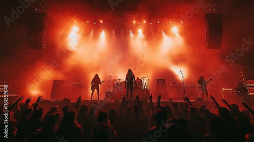 Wide shot of a rock band on stage, concert lighting, a red and black color scheme
