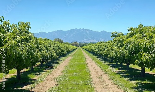 fruit farm, tree, fruit, sky, mountain, path, grass, green, blue, clear, sunny, day, row, straight, long, distance, hill, horizon, natural, landscape, scenic, view, summer, growth, agriculture, farming, rural, countryside, sunlight, shadow, ground, earth, crop, field, plant