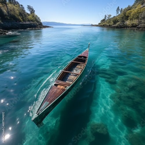 wide top view photo of an Isolated old wooden boat floating and decking on clear blue lake water in a sunny day