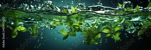 Wide under water banner photo of floating fresh leaves on clear clean water splash in dark blue background