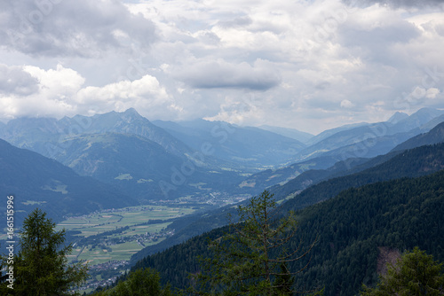 Wide valley view with layered mountain ranges, cloudy sky, villages and fields in the distance, panoramic alpine landscape