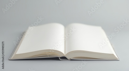 Wide view of open notebook with white pages on gray backdrop, even light, minimal and tranquil creativity focus