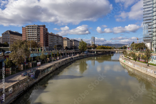 Widok na północny zachód z Rossauer Brucke w Wiedniu, Austria