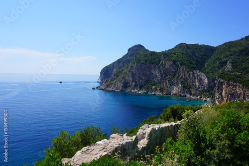 sea, coast, beach, blue, landscape, water, nature, mediterranean, greece, heaven, coastline, corfu, summer, europa, vacation, ocean, adriatic, travel, view, mountain, rock, boat, seascape