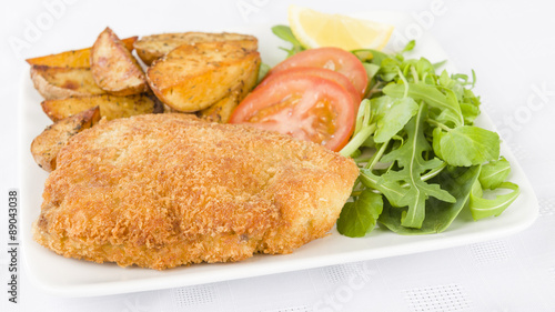 Wiener Schnitzel - Veal steak breaded and fried in butter served with salad, potato wedges and a lemon slice.