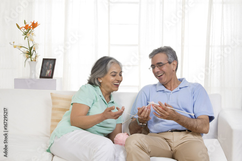 mature adult, two people, indoor, studio shot, sitting, looking away, half face, front view, casual clothes, couple, married, husband, wife, loving, affection, human relationships, togetherness, living room, sofa, couch, photo, frame, picture, holding, recreation, relaxing, knit up, pink, smiling, toothy smile, happiness, spectacle, helping, teaching, learning
