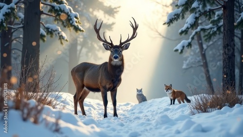 wild animals in winter, deer, red fox, snowy owl, pine forest, snowfall, soft fog, untouched nature, majestic wildlife, cartoon, poster, wallpaper, postcard, illustration , painted