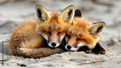 Wild baby red foxes cuddling at the beach