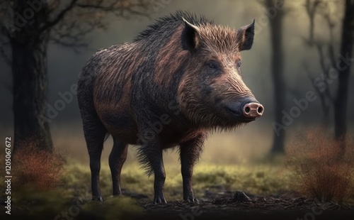 wild, boar, pig, forest, nature, wildlife, animal, mammal, wood, tree, bush, grass, ground, leaf, branch, timberland, feral, sus, snout, tusk, hoof, eye, ear, fur, brown, black, grey, dark, green, soft, sharp, muddy, rustic, natural, outdoors, rural, daytime, cloudy, morning, evening, landscape